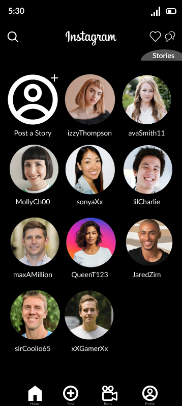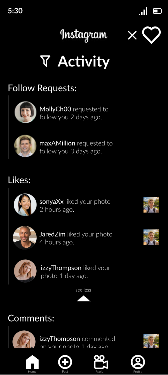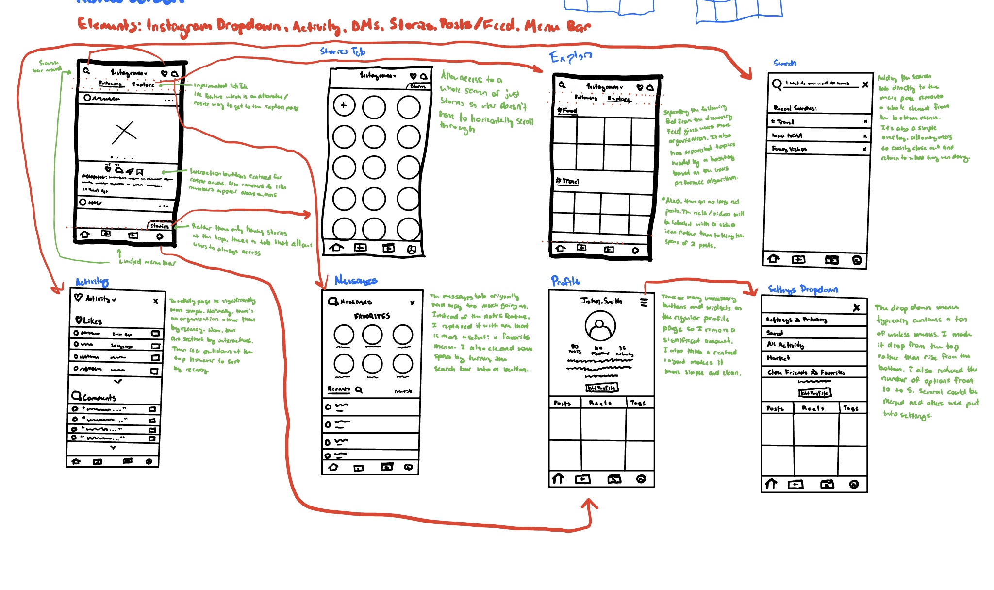 The screens displayed are my updated and “improved” version of Instagram’s features current to 2024. Many activities within the app are separated to improve app organization and to reduce user confusion. I also experimented with and implemented a hierarchy system, which is rarely/minimally used in Instagram’s current UI.